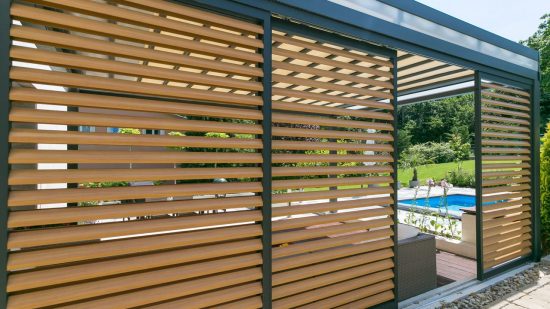 Függesztett szerkezetű alumínium keretvázas szerkezet. Az alumínium keretbe fix állású, dőlt lamellák kerülnek. A lamellák közt az átláthatóság nem szűnik meg viszont a ferdén érkező napsugarakat nem engedi be a teraszra. Egyszerűen szerelhető, kézi mozgatású rendszer, egyszerű mechanikával. Felső sínpályás, alsó megvezetőrendszer, hibamentes működéssel.