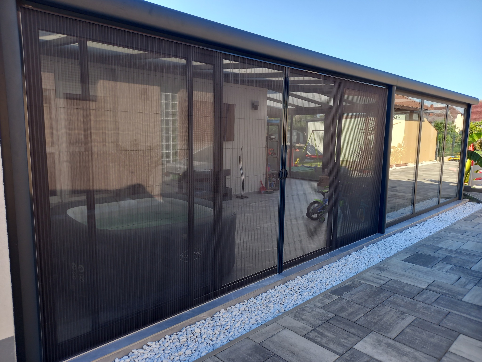 Toló üvegszerkezet elé építhető rovarháló, árnyékolórendszer